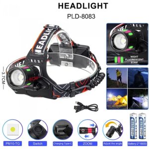Налобний ліхтар FLUORESCENCE 8083 TG+COB акумуляторний з одним переднім діодом TG та COB. Має оптичний зум, один режим роботи (100%) і регульований нахил голови. Працює від двох акумуляторів 18650 та заряджається через USB Type-C.