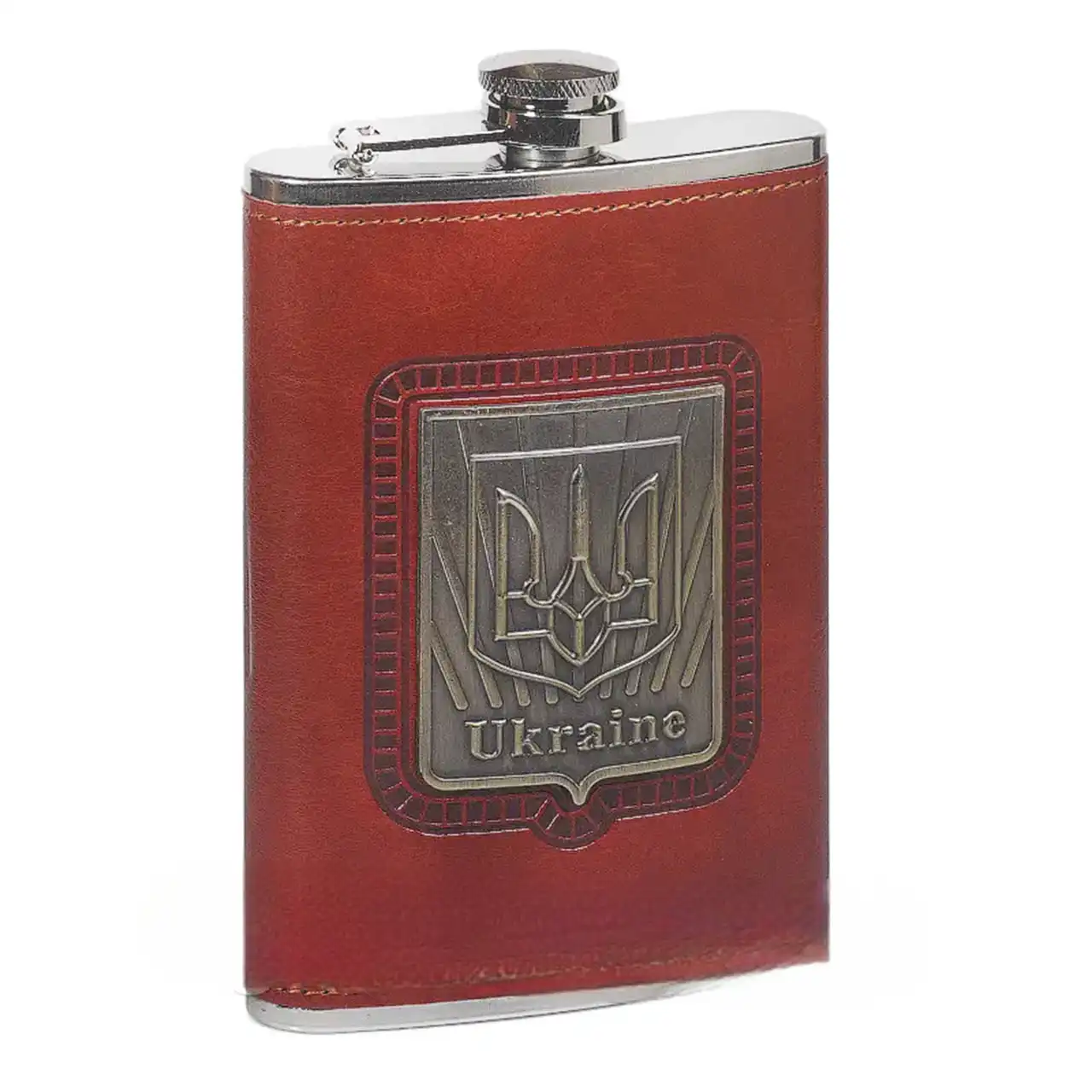 Фляга прикрашена українською символікою та виготовлена з **нержавіючої сталі**, що забезпечує її міцність і довговічність.