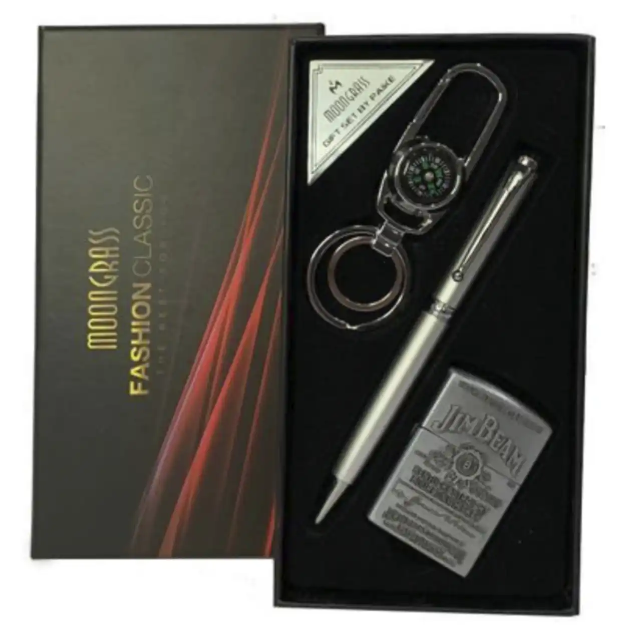 Комплектація: брелок-карабін із компасом, металева ручка, газова кремнієва запальничка Jim Beam
