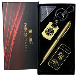 До комплекту входить металевий брелок Volkswagen зі шкіряною вставкою та надійним кільцем для ключів, металева кулькова ручка золотистого кольору, зручна для щоденного використання, а також газова запальничка з логотипом Volkswagen, виконана у чорному кольорі з золотими акцентами.