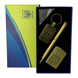 Подарунковий набір WKL 108 Ukraine — стильний патріотичний комплект з газової запальнички, кулькової ручки та металевого брелока з українською символікою. Готове рішення для подарунка, сувеніра або ділового презенту.
